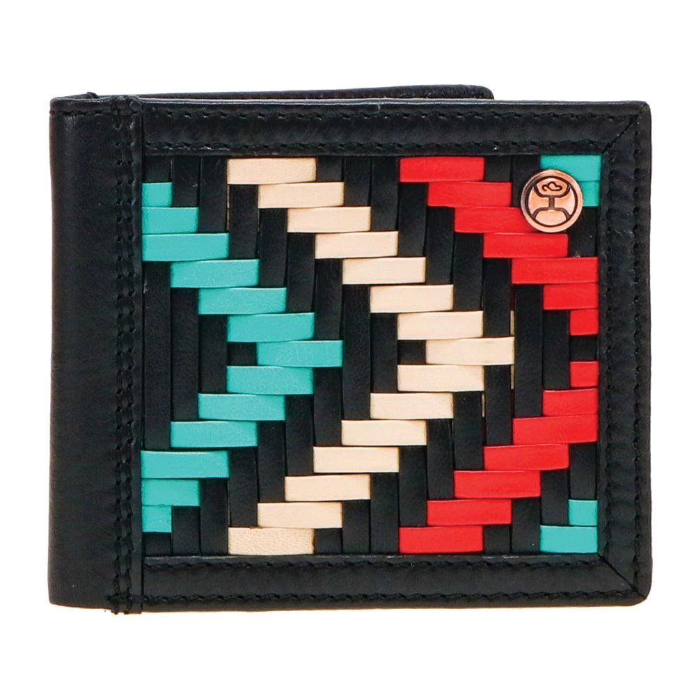 This Hooey bifold wallet features hand-woven leather detailed with Aztec print inlay, black/red/Ivory/ exterior with black interior, and includes our custom Hooey brand woven logo liner.Â
