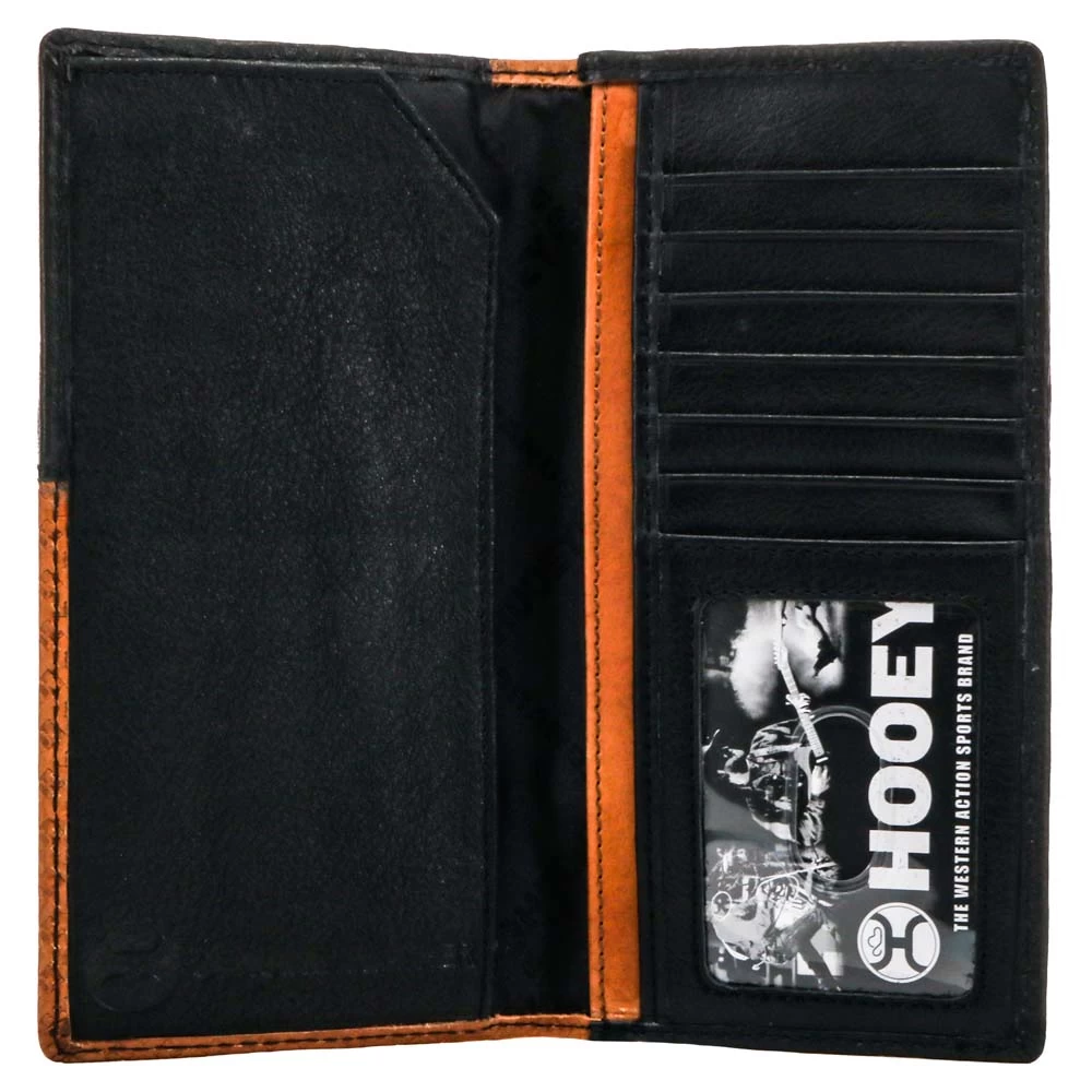 This Hooey rodeo wallet features a basket weave detailed exterior and black interior with black leather corner overlay and includes our custom hooey brand woven logo liner.Â