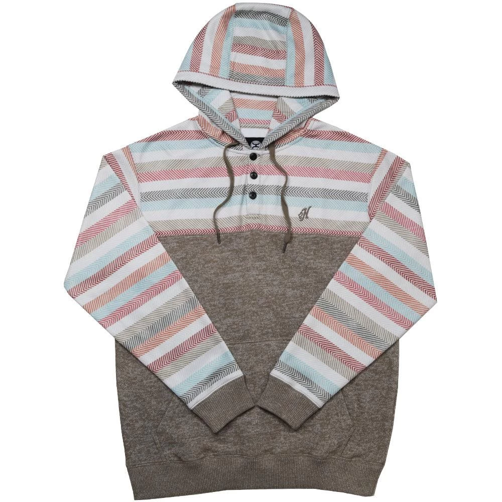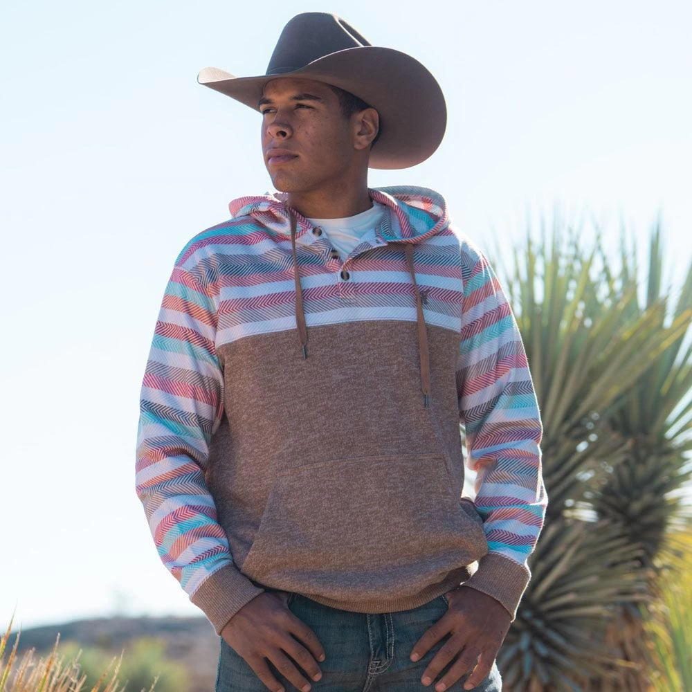 This oatmeal brown men’s pullover hoodie features a striped Baja design with braided drawstrings and three buttons at the top for showcasing layered clothing underneath. This hoodie features a cotton-polyester blend that makes it durable, warm, and soft. Practical for cool or cold weather, this casual and comfortable Baja hoodie is great for everyday wear.