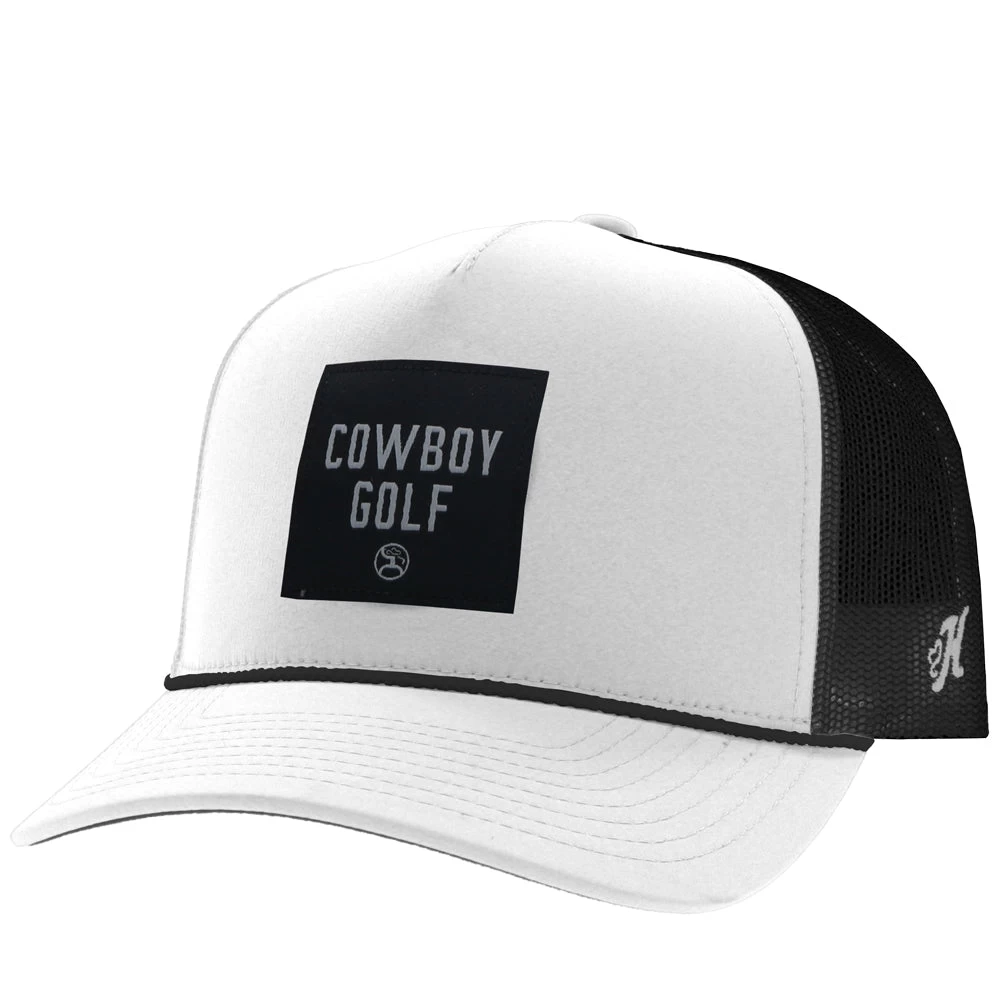 This black and white “Cowboy Golf” hat has a stylish square patch. The white with black mesh design is highlighted with a white Hooey logo embroidered for a neat finish. This hat offers a classic, high-profile look with a 5-panel structure, a one-size-fits-all feature, and a curved bill.