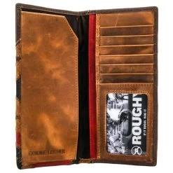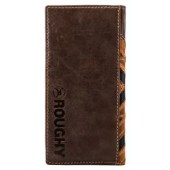 This Roughy rodeo wallet features patchwork with brown leather overlay, detailed with red & black logo and includes our custom hooey brands woven logo liner.