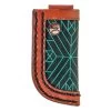 This Roughy pancake knife sheath features black, turquoise embossed aztec pattern with brown double welt accent edge.