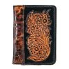 This Hooey front pocket bifold wallet features a laser cut hands-up Hooey Logo, detailed with sunset serape print inlay exterior and tan interior, and includes our custom hooey brand woven logo liner.
