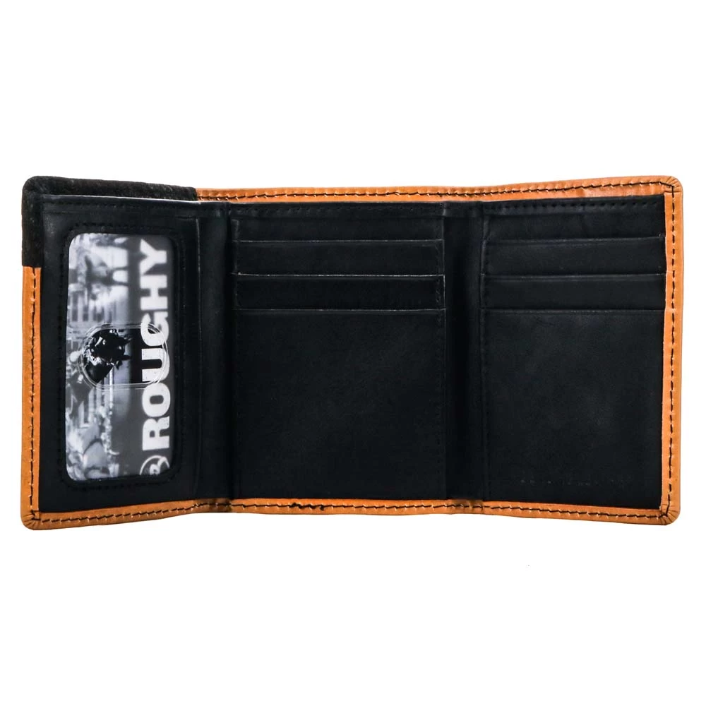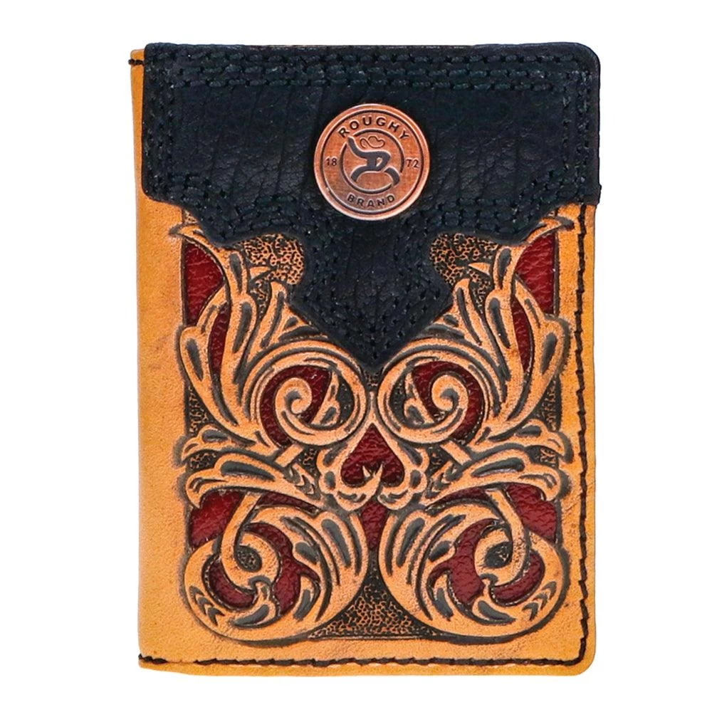 This Roughy trifold wallet features hand-tooled leather with red inlay, black bullhide overlay and roughy 1872 concho and includes our custom hooey brands woven logo liner.