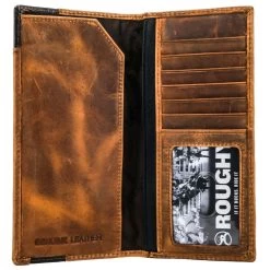 This Roughy rodeo wallet features diamond patchwork, detailed with black ostrich print inlay & roughy 1872 logo concho and includes our custom hooey brands woven logo liner.