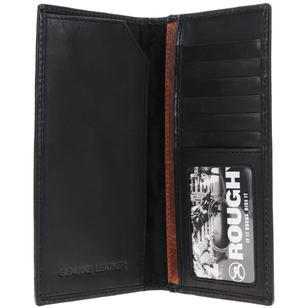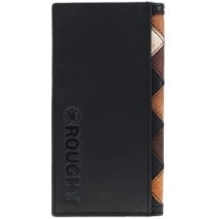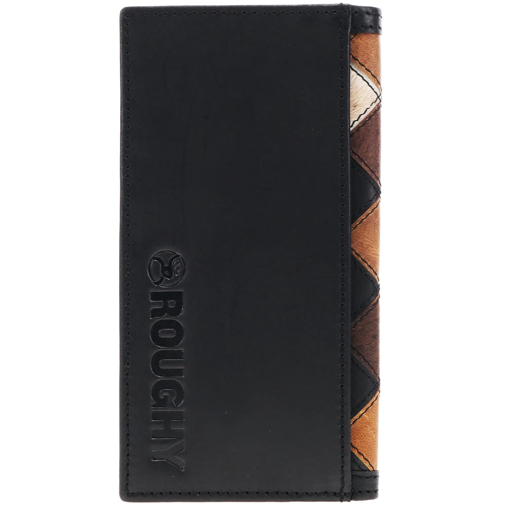 This Roughy rodeo wallet features brown & black patchwork , detailed with salt n pepper hair on leather inlay and includes our custom hooey brands woven logo liner.
