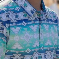 Its construction combines the underarm seam with moisture-wicking and quick-drying technologies, while also providing UPF 30 Sun Protection. Its easy wash-and-wear design, embroidered logo, and athletic fit make this Teal, Blue, and Grey Aztec pattern polo a perfect weekend option.