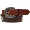 This Hooey classic men’s belt features brown leather, detailed filigree embossed with brown double welt edge and black accents.