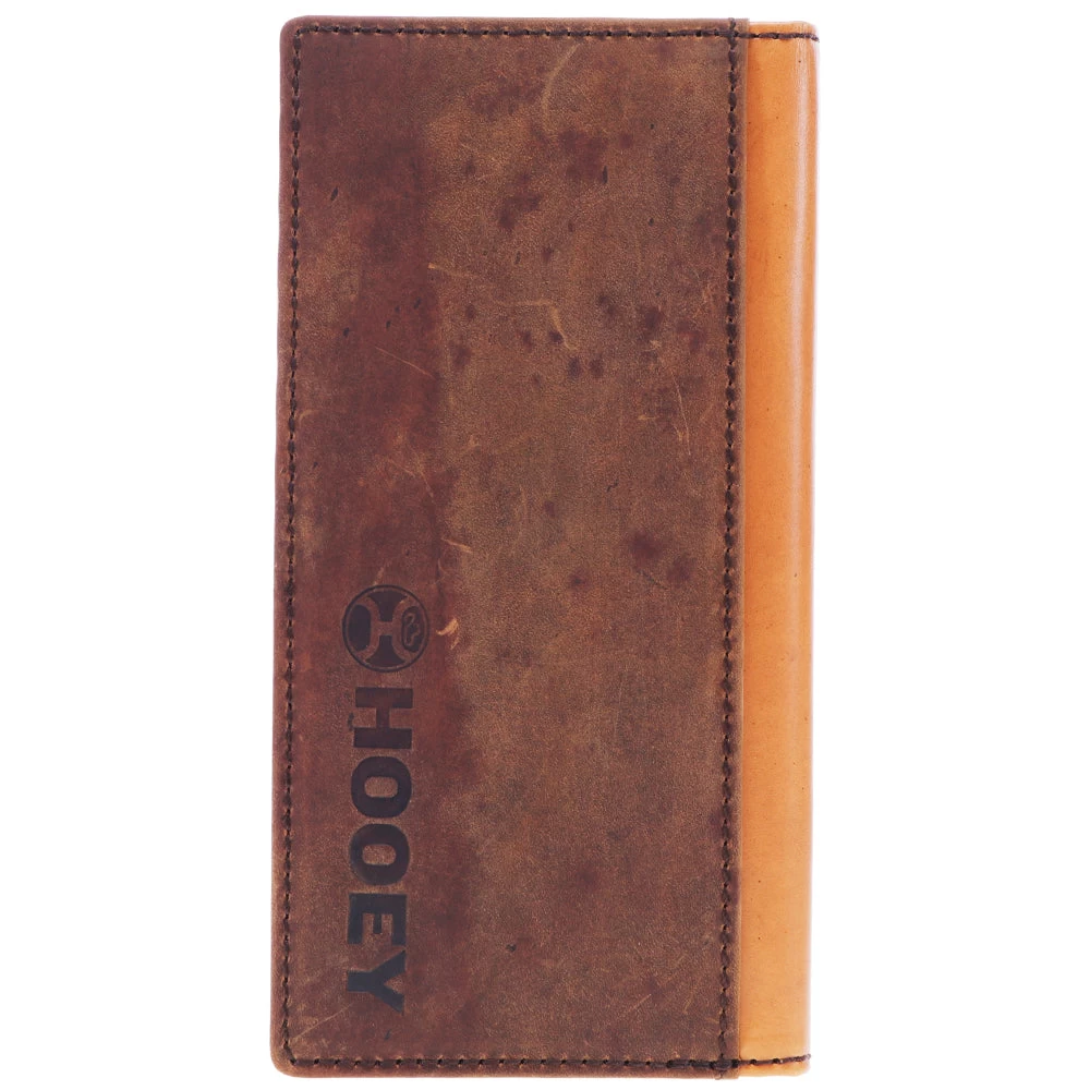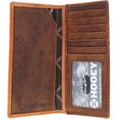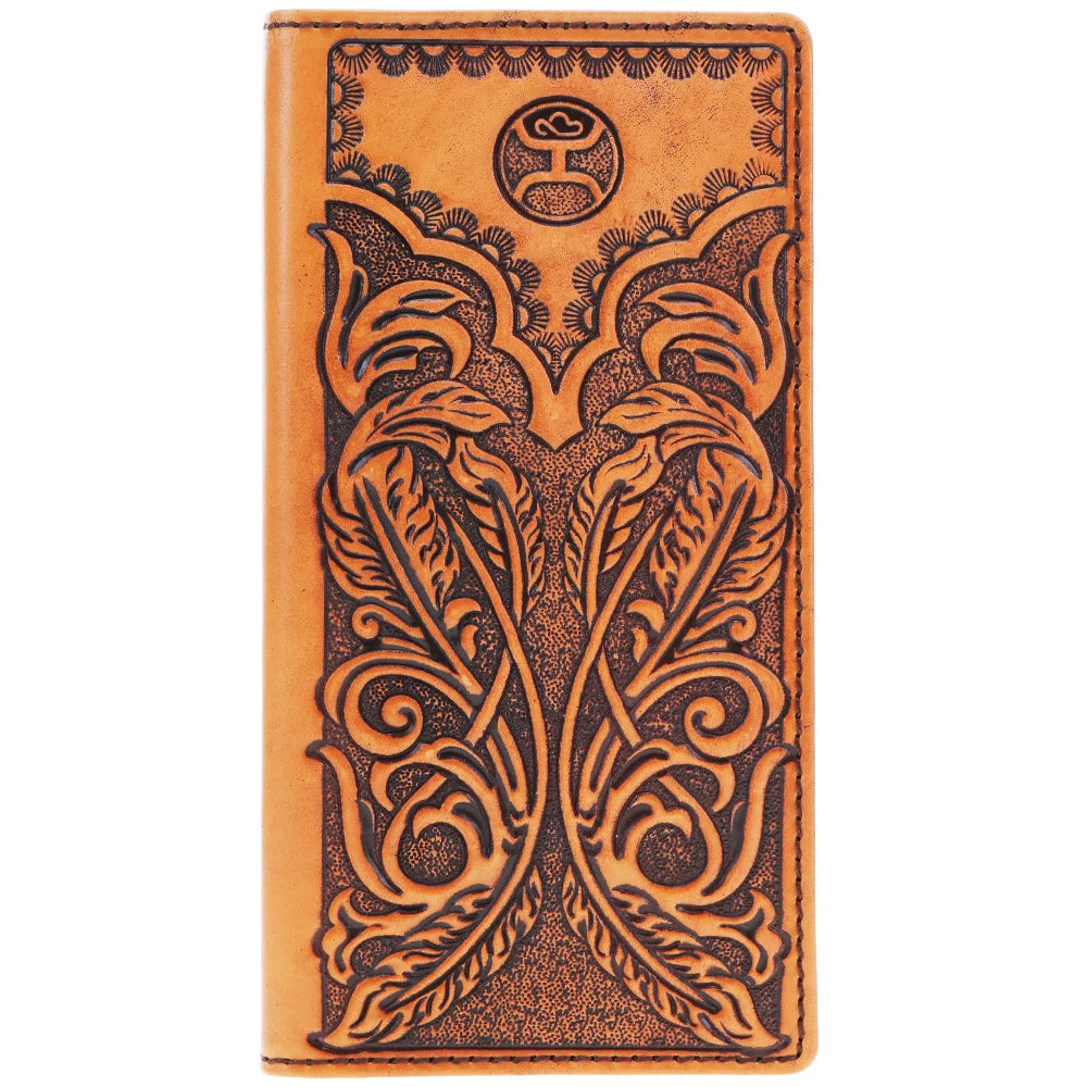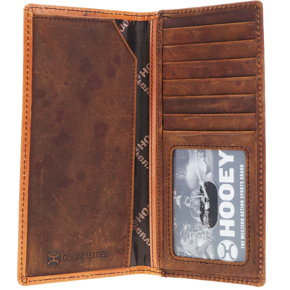 This Hooey rodeo wallet features hand-tooled leather detailed with heat branded 2.0 hooey logo, laser cut details & black leather inlay. Tan/black exterior & interior and includes our custom hooey brands woven logo liner.